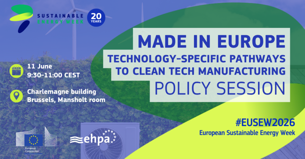 Part of the EU Sustainable Energy Week (9–12 June), this policy session, organised by EHPA and the European Commission’s DG GROW, explores how to strengthen Europe’s clean tech manufacturing base while ensuring the rapid, affordable, and secure deployment of clean energy technologies.