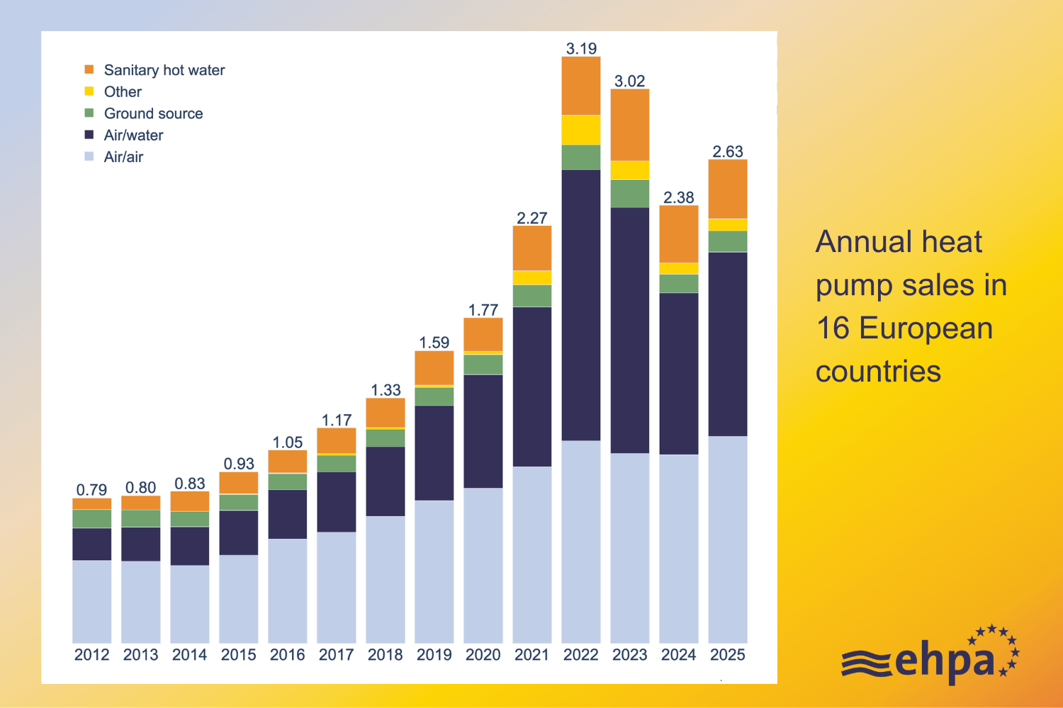 Heat pump sales in 2025 grew by 11% across 16 European countries* on average, preliminary data from the European Heat Pump Association shows. Around 2.63 million residential heat pumps were sold, up from 2.38 million in those countries in 2024 and bringing the total installed in Europe to around 28 million.