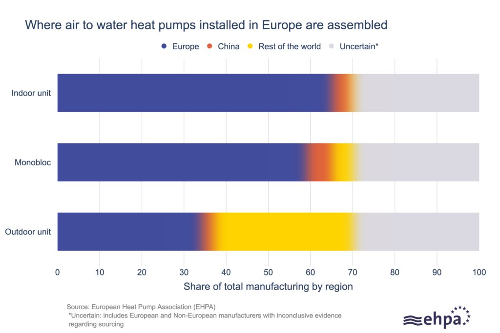 The vast majority of air to water heat pumps installed in Europe are assembled in Europe, new data from the European Heat Pump Association representing over two-thirds of the market reveals. This compares to only around 10% which are assembled in China.