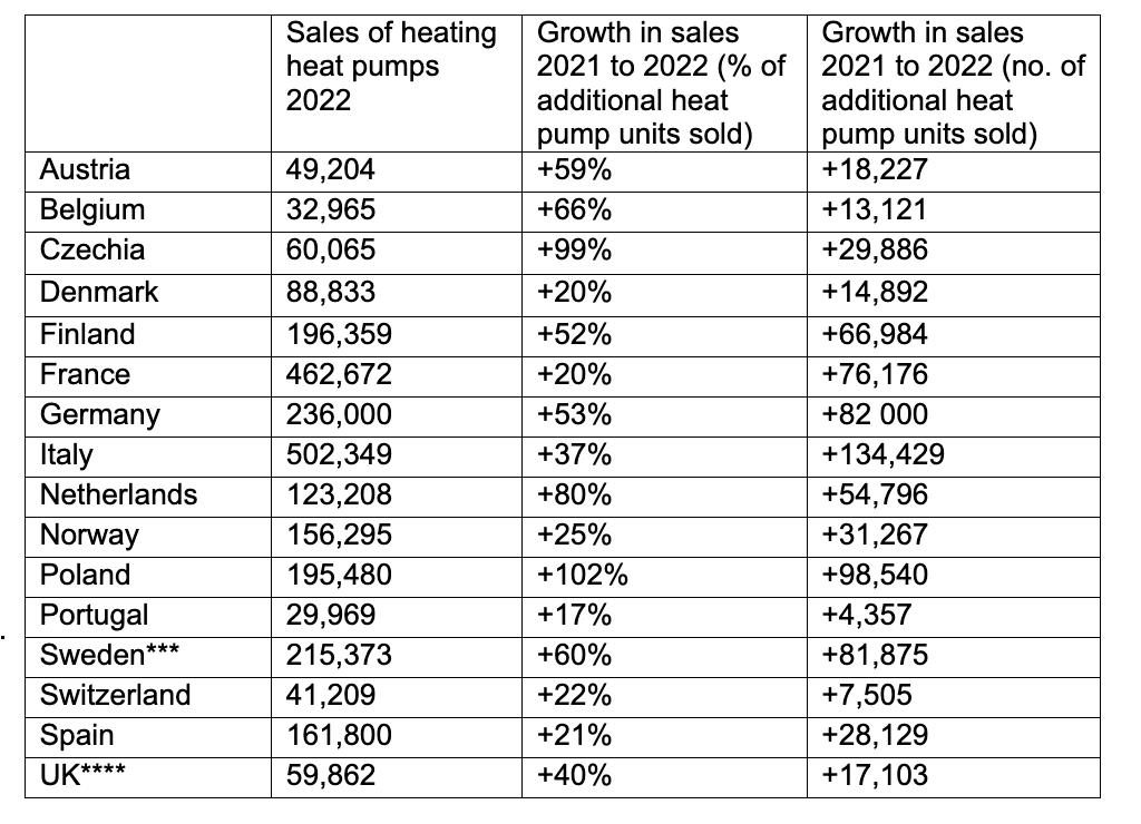 In terms of increases in heating heat pump sales compared to 2021, Poland leads by quite a margin with slightly above +100% over 2021’s sales, followed by Czechia (99%), the Netherlands (+80%), Belgium (+66%), Sweden (+60%), Austria (+59%), Germany (+53%) and Finland (+52%). A second group of countries shows strong growth between 20 and 40%: the UK (40%, but based on estimates not official figures); Italy (+37%), Norway (+25%), Spain (+21%), Switzerland (+22%) and Denmark and France (both +20%).